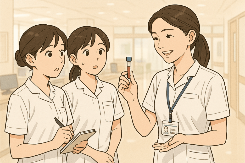 私は今、外来勤務なんだけど、病棟の新人ちゃんが「採血の簡易検査って外来にしかないですよね?休日にも触れるようになりたくて…」ってわざわざ外来まで声かけに来てくれたんです。そんな前向きな気持ちで来てくれるのがまず嬉しくて。「いいよいいよ、一緒にやってみよう!」って、さっそく検体準備から流れを私が実践しながら説明することに。