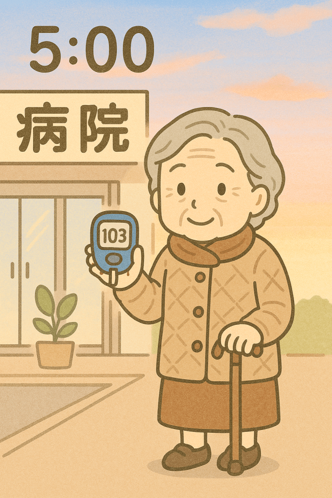 パジャマのまま、上着を羽織って、両手には血糖測定器。